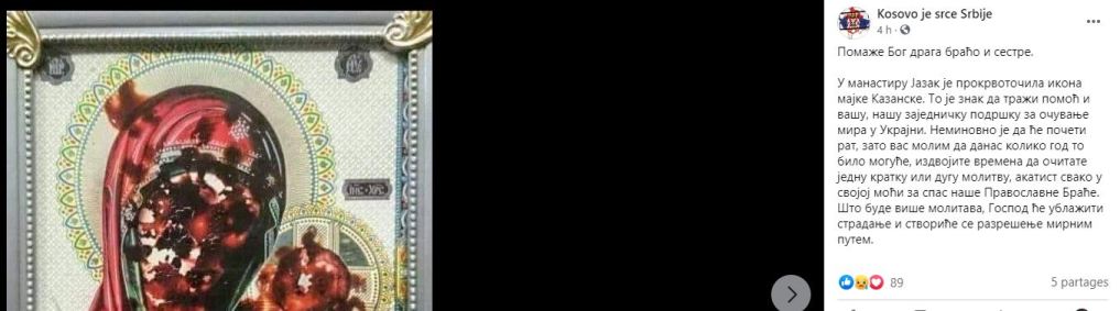The icon of Our Lady of Kazan in the Jazak Monastery in Serbia is bleeding! The apparition of the Holy Virgin as the Lady of Kazan is considered as the Protective Mother of Russia and thus this event maybe is related to events in Ukraine and Russia…