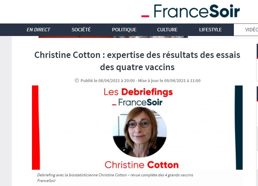 H βιοστατιστικολόγος Christine Cotton: πραγματογνωμοσύνη στα αποτελέσματα των κλινικών δοκιμών των τεσσάρων εμβολίων.Καταπέλτης η μελέτη. Στο μικροσκόπιο της έρευνας η αξιοπιστία των εμβολίων και των κλινικών τους δοκιμών. Βιοστατιστικολόγος Christine Cotton για δοκιμές των 4 εμβολίων:τα αποτελέσματα τους δεν δικαιολογούν έγκρισή από FDA,ΕΜΑ! πως εμβολιάζετε μαζικά για 1 ασθένεια με ποσοστό θνησιμότητας 0,11% όταν η εποχική γρίπη φτάνει στο 10%; αδικαιολόγητος ο μαζικός εμβολιασμός υπερηλίκων μ’εμβόλιο που δεν δοκιμάστηκε σ΄ηλικιωμένους!Άγνωστη διάρκεια ανοσίας.Είναι ο γαλλικός (ελληνικός) πληθυσμός συγκρίσιμος με τους πληθυσμούς των δοκιμών; Ανεπαρκής χρόνος παρακολούθησης για αξιολόγηση ανοσίας μεσοπρόθεσμα,μακροπρόθεσμα.Για την ανάπτυξη φαρμάκου ως τελική του έγκριση απαιτούνται 10 χρόνια το ανέπτυξαν σε 3 μήνες συνέτριψαν τις προδιαγραφές πως είναι ασφαλές .(σσ.Ούτε καν φάρμακο όχι εμβόλιο δεν πρέπει ν’ αποκαλείται είναι ένα προϊόν που παράτυπα πήρε έγκριση αφού δεν πληρούσε τα στάνταρς.)