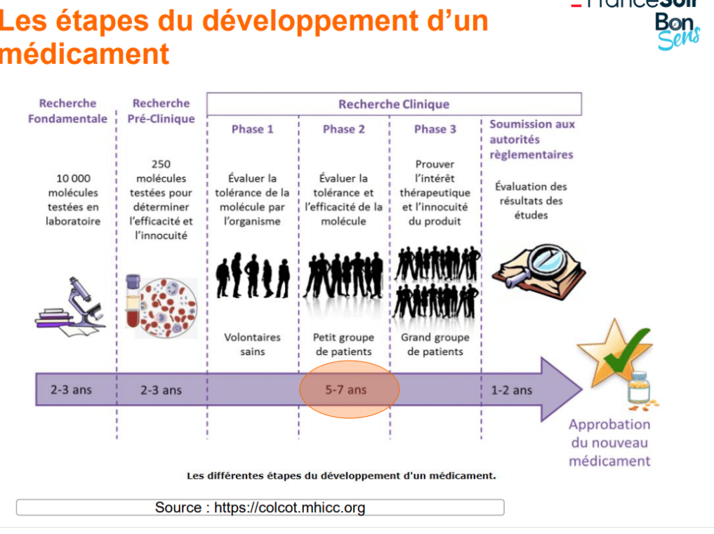 Παρουσιάζει το προβλεπόμενο χρονοδιάγραμμα για την ανάπτυξη ενός φαρμάκου ως τελική του έγκριση. Απαιτούνται τουλάχιστον 10 χρόνια αυτοί το ανέπτυξαν και το έριξαν στην αγορά σε 3 μήνες και το καθιστούν και υποχρεωτικό..Για ένα φάρμακο πριν φτάσει στον ασθενή (σσ.πολύ περισσότερο στον υγιή) απαιτούνται: 3 χρόνια θεμελιώδη εργαστηριακή έρευνα, 3 χρόνια προκλινική έρευνα, 7 χρόνια σε 3 φάσεις κλινική έρευνα,1 με 2 χρόνια αξιολόγηση αποτελεσμάτων κατά την υποβολή του σε ρυθμιστικές αρχές.. (σσ.Τίποτα δεν τήρησαν εξπρές διαδικασία εξωφρενικά παράτυπη) francesoir 8/4/21