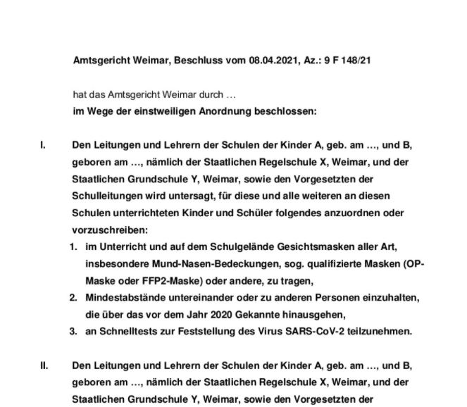 Και καθώς οι Έλληνες μαθητές μαζικά υποβάλλονται σε rapid test επονομαζόμενα κι ως Self tests στις 8 Απριλίου 2021, το Οικογενειακό Δικαστήριο της Βαϊμάρης έκρινε σε επείγουσα διαδικασία ότι δύο σχολεία της Βαϊμάρης απαγορεύεται με άμεσο αποτέλεσμα να απαιτούν από τους μαθητές να φορούν όλα τα είδη καλύμματα στόματος και μύτης (ειδικά μάσκες κατάλληλες όπως μάσκες FFP2) να διατηρούν AHA μίνιμουμ αποστάσεις και / ή να συμμετέχουν σε rapid tests για SARS-CoV-2. Ταυτόχρονα, το δικαστήριο έκρινε ότι η διδασκαλία στην τάξη πρέπει να διατηρηθεί (απόφαση πλήρους κειμένου, συμπεριλαμβανομένων τριών εκθέσεων εμπειρογνωμόνων).Το δικαστήριο στην απόφασή του αναφέρει επικαλείται το δικαίωμα στην ελεύθερη ανάπτυξη της προσωπικότητας και στη φυσική ακεραιότητα του άρθρου 2 του βασικού νόμου, καθώς και στο άρθρο 6 του βασικού νόμου για το δικαίωμα στην εκπαίδευση. Κρίνει ότι τα προαναφερθέντα μέτρα παραβιάζουν πολλά δικαιώματα των παιδιών και των γονέων τους σύμφωνα με το νόμο, το σύνταγμα και τις διεθνείς συμβάσεις.(σσ. στην Ελλάδα δεν παραβιάζουν τ΄αντίστοιχα;) Προκαλούν σημαντική αναστάτωση / ζημία που δεν αντισταθμίζεται από κανένα ευδιάκριτο όφελος για τα ίδια τα παιδιά ή για τρίτα μέρη. Το Δικαστήριο αποφάσισε ότι: Ο εξαναγκασμός των μαθητών να φορούν μάσκες και να διατηρούν την απόσταση μεταξύ τους και άλλους βλάπτει τα παιδιά σωματικά, ψυχολογικά, εκπαιδευτικά και στην ψυχοκοινωνική τους ανάπτυξη, περισσότερο από ένα οριακό όφελος για τα ίδια τα παιδιά ή για τρίτους. Στηρίχθηκε σε εκθέσεις εμπειρογνωμόνων: γιατρoύ της υγιεινής Καθ. Dr. med Ines Kappstein, ψυχολόγου Δρ Christof Kuhbandner και βιολόγου Καθ. Δρ rer. biol. Χμμ. Ο Ulrike Kämmerer.