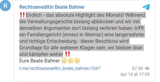 Για πρώτη φορά, κατατέθηκαν αποδεικτικά στοιχεία σε γερμανικό δικαστήριο σχετικά με την επιστημονική σημασία και αναγκαιότητα των προβλεπόμενων μέτρων κατά covid. Ο Γερμανός δικηγόρος Beate Bahner γράφει για την ετυμηγορία στο Telegram: «..Ενώ τα διοικητικά δικαστήρια έχουν μπλοκάρει μέχρι στιγμής και έχουμε χάσει εκεί με τα ίδια επιχειρήματα μέχρι στιγμής, ένα οικογενειακό δικαστήριο (που βρίσκεται στη Βαϊμάρη) εκδίδει μια σωστή και πολύ καθυστερημένη απόφαση – αυτή η απόφαση θα είναι η βάση για όλες τις άλλες δίκες. Μείνετε συντονισμένοι και συνεχίστε να πολεμάτε “.