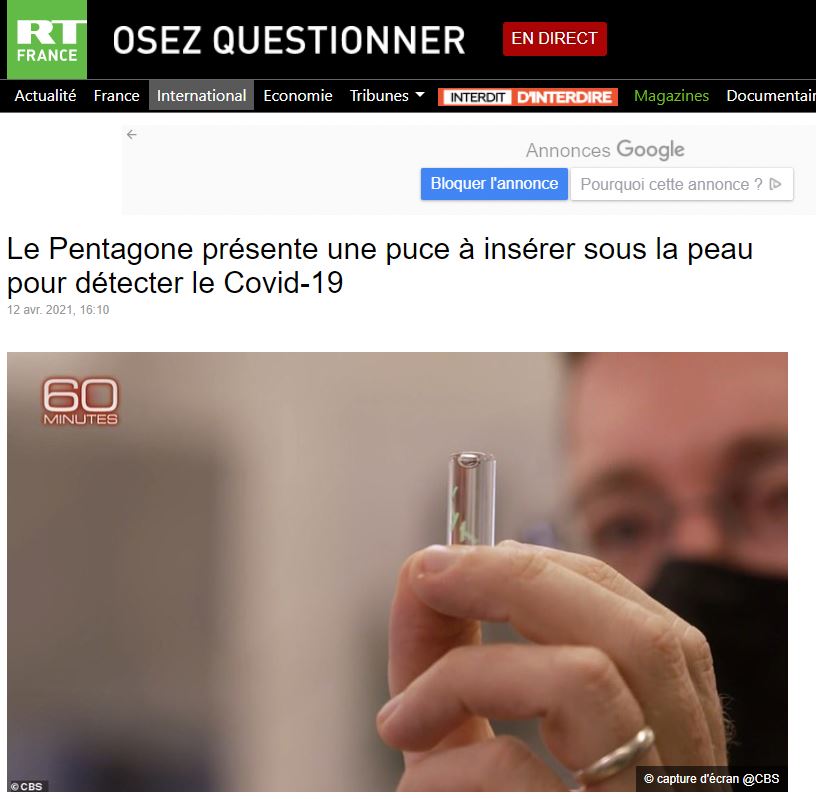 To αγγλόφωνο rt αναφέρει: Οι επιστήμονες του Πενταγώνου αποκάλυψαν ένα εμφύτευμα μικροτσίπ που μπορεί να ανιχνεύσει μια μόλυνση Covid. Το τσιπ, το οποίο είναι εξοπλισμένο με μια μικρή κεραία, προορίζεται να λειτουργεί σαν φως «κινητήρα ελέγχου», εντοπίζοντας ασυμπτωματικά κρούσματα της νόσου.
