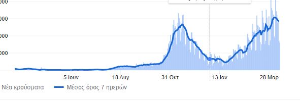 Σήμερα 13/4/21 ανακοινώθηκαν στην Ελλάδα από ΕΟΔΥ: 4033 νέα ημερήσια κρούσματα, 93 νέοι θάνατοι.Ο αριθμός των ασθενών που νοσηλεύονται διασωληνωμένοι είναι 802, αριθμός ρεκόρ.