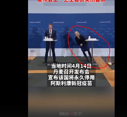 Κατά τη διάρκεια συνέντευξης τύπου κι ενώ ανακοίνωσε ότι η Δανία σταματάει προσωρινά τη χρήση του εμβολίου AstraZeneca – λόγω ανησυχιών για θρομβώσεις που μεταδόθηκε ζωντανά από την τηλεόραση, η Tanja Erichsen, που είναι διευθυντής της Δανικής Υπηρεσίας Φαρμάκων, λιποθύμησε την Τετάρτη το απόγευμα.