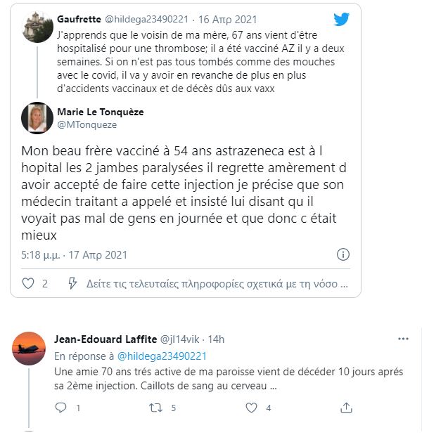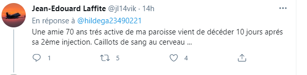 Ορφανά χτυπήματα των εμβολίων;;; Καταγράφονται, προσμετρώνται κανείς δεν ξέρει αφού θα πρέπει πρώτα να δηλωθούν από άμεσα εμπλεκόμενους. Το γαλλικό διαδίκτυο είναι γεμάτο από αναφορές για θανάτους και θρομβώσεις από τα αμφιλεγόμενα ”εμβόλια”.Μια μόνο διαδικτυακή ψαριά στο twitter έβγαλε όλα τα παρακάτω κι όλα αυτά μόνο σε 1 ανάρτηση. Η πρώτη είναι η κύρια ανάρτηση και τα υπόλοιπα σχόλια επί αυτής: