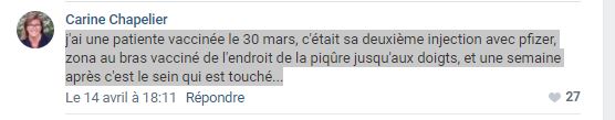 Γιατρός από τη Γαλλία καταγγέλει: ”Eίχα μια ασθενή εμβολιασμένη στις 30 Μάρτη ήταν η β΄δόση με Pfizer. Παρουσίαζε έρπητα ζωστήρα στο εμβολιασμένο μπράτσο στο μέρος που δέχθηκε το εμβόλιο και μέχρι τα δάχτυλα σε όλο το χέρι και μια εβδομάδα μετά και στο στήθος..”