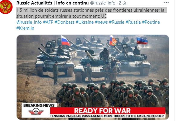 Αυξάνονται οι εντάσεις καθώς η Ρωσία στέλνει περισσότερες δυνάμεις στα ουκρανικά σύνορα..Πληροφορίες αναφέρουν πως η Ρωσία έχει μεταφέρει τον κυριότερο όγκο των στρατευμάτων της στο ουκρανικό μέτωπο πλησίον των ουκρανικών συνόρων και όχι μόνο 150.000…Αν και τα στοιχεία που δίνονται είναι κάπως αποπροσανατολιστικά σε αριθμούς για ευνόητους λόγους ωστόσο το μήνυμα είναι σαφές..Συνεχείς ενισχύσεις καταφθάνουν.Η Ρωσία είναι έτοιμη για πολεμική επιχείρηση κι η κατάσταση θα μπορούσε να επιδεινωθεί ανά πάσα στιγμή..Η Ρωσία είναι έτοιμη για μια επιχείρηση που θυμίζει το Β Παγκόσμιο και υπερβαίνει κατά πολύ το ουκρανικό, είναι έτοιμη για όλα…