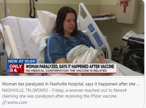Γυναίκα που βρίσκεται σε κατάσταση παράλυσης στο νοσοκομείο του Nashville στο Tennessee στις ΗΠΑ, λέει ότι της συνέβη αφού εμβολιάστηκε με το ”θαυματουργό” Pfizer. (WSMV) Την Παρασκευή, μια γυναίκα μίλησε στο News4 ισχυριζόμενη ότι είχε παραλύσει μετά τη λήψη του εμβολίου Pfizer. Η Brandy McFadden έλαβε τη δεύτερη δόση του εμβολίου Pfizer στις 16 Απριλίου. “Μόλις άρχισα να μην νιώθω καλά”, θυμάται. Η Brandy McFadden έλαβε τη δεύτερη δόση του εμβολίου Pfizer στις 16 Απριλίου. Μέχρι το επόμενο απόγευμα, η Mcfadden είπε ότι δεν μπορούσε να περπατήσει και είχε βασανιστικό πόνο στον αυχένα.