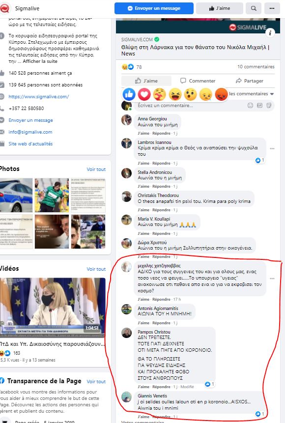 Θύελλα διαμαρτυριών ξεσήκωσε στην Κύπρο στα μέσα κοινωνικής δικτύωσης η ανακοίνωση του θανάτου του Νικόλα Μιχαήλ από τη Λάρνακα χρόνια πάσχοντα από την λευχαιμία που κατέληξε κι ωστόσο σύμφωνα με τις καταγγελίες το Υπουρεγίο Υγείας τον συναρίθμησε στους νεκρούς από covid19. ” Ο Νικόλας είχε διαγνωστεί το 2012 με λευχαιμία και έκτοτε έδινε τη δική του μάχη για τη ζωή, ωστόσο, δεν τα κατάφερε και απεβίωσε σήμερα Μεγάλη Παρασκευή. Εξαιτίας της ασθένειας, είχε υποστεί απώλεια όρασης ενώ ήταν καθηλωμένος σε αναπηρικό καροτσάκι. Ο Νικόλας είχε διαγνωστεί το 2012 με λευχαιμία και έκτοτε έδινε τη δική του μάχη.” αναφέρει το sigmalive επιχειρώντας ν΄αποκαταστήσει το κοινόν περί δικαίου αίσθημα. Ωστόσο στην σελίδα του fb του ίδιου μέσου κάτω από την ανάρτηση του συγκεκριμένου άρθρου βροχή τα μηνύματα και οι καταγγελίες για την στάση του Υπ. Υγείας που μάλιστα του χρεώνουν πρόθεση να θέλει να τρομοκρατήσει τον κόσμο με τον κορωνοιό..Γράφουν οι αναγνώστες χρήστες: