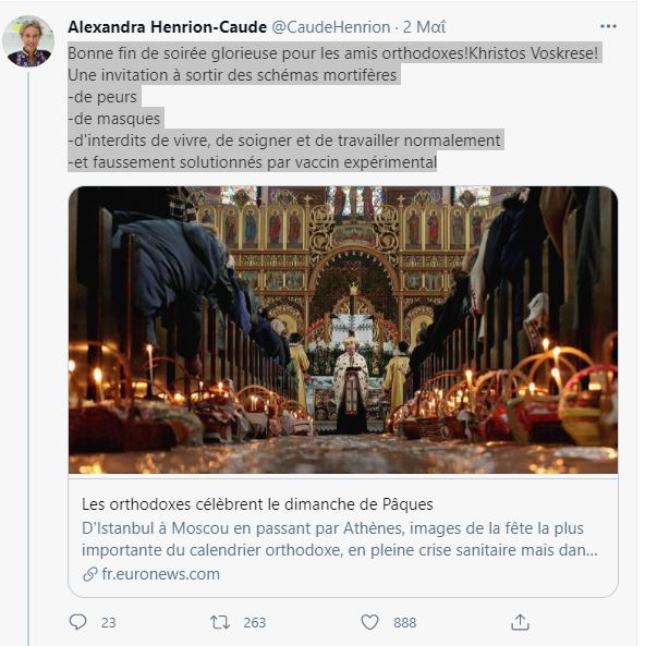 Η κορυφαία Γενετίστρια στη Γαλλία Alexandra Henrion-Caude θεολογεί ορθώς την ώρα που Πολιτεία-Εκκλησία στην Ελλάδα καμώνονται… τις μωρές παρθένες. Εύχεται: Χριστός Ανέστη ” στους Ορθόδοξους φίλους πρόσκληση για έξοδο από θανατηφόρα σχέδια φόβους, μάσκες,απαγόρευση ζωής,υγείας,εργασίας και πειραματικό εμβόλιο!!!!!! Γράφει στο twitter