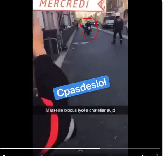 Αστυνομικός μοτοσικλετιστής ενώ ήταν εν στάσει αναπτύσσει ταχύτητα και παρασύρει μαθητή έξω από Λύκειο στη Γαλλία στη Μασαλία σε μαθητή κινητοποίηση αποκλεισμού σχολείου στο Λύκειο Le Chatelier.Το βίντεο είναι κόλαφος. Αποδεικνύεται δόλος. Πρόκειται για απόπειρα κατά της ζωής ηθελημένη και σκόπιμη. Είναι απόπειρα δολοφονίας μαθητή από καμικάζι μοτοσικλετιστή της αστυνομίας που αιφνιδιάζει ως και τον συνάδελφό του που ήταν στη σκηνή.