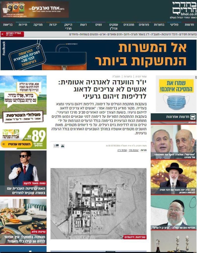 Είδηση σοκ. Το ισραηλινό πρακτορείο ειδήσεων BHOL που ρεπόρτερ του έχουν διασυνδέσεις με το Channel 20 και σχετίζεται με τις συσκευές-εξοπλισμούς ασφαλείας επικαλούμενο τον επικεφαλής ή μεγαλοστέλεχος του Συμβουλίου Πυρηνικής Ενέργειας του Ισραήλ αναφέρει ότι το ωστικό κύμα του πυραύλου της Συρίας που εκτοξεύθηκε πριν λίγες μέρες κατά της πυρηνική εγκατάστασης της Dimona προκάλεσε σε αυτήν υλικές ζημιές στη δομή και προκάλεσε διαρροή ραδιενεργών υλικών.