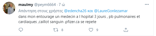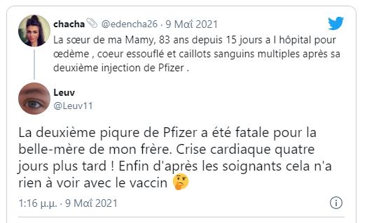 Γεμάτο το γαλλικό διαδίκτυο από ορφανά μετεμβολιακά χτυπήματα..” Η αδερφή της γιαγιάς μου 83 ετών εδώ και 15 μέρες είναι στο νοσοκομείο για οίδημα ,φύσημα στην καρδιά και πολλαπλές θρομβώσεις μετά την δεύτερη δόση εμβολίου της Pfizer..” καταγγέλει μια χρήστης στο twitter στις 9.5.21