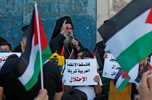 Ο Ελληνορθόδοξος Επίσκοπος Σεβάστειας της Παλαιστίνης, Atallah Hanna, μιλά κατά τη διάρκεια διαδήλωσης στη Βηθλεέμ, καταδικάζοντας τον ισραηλινό βομβαρδισμό της Γάζας και προς υποστήριξη της σταθερότητας της συνοικίας Sheikh Jarrah.