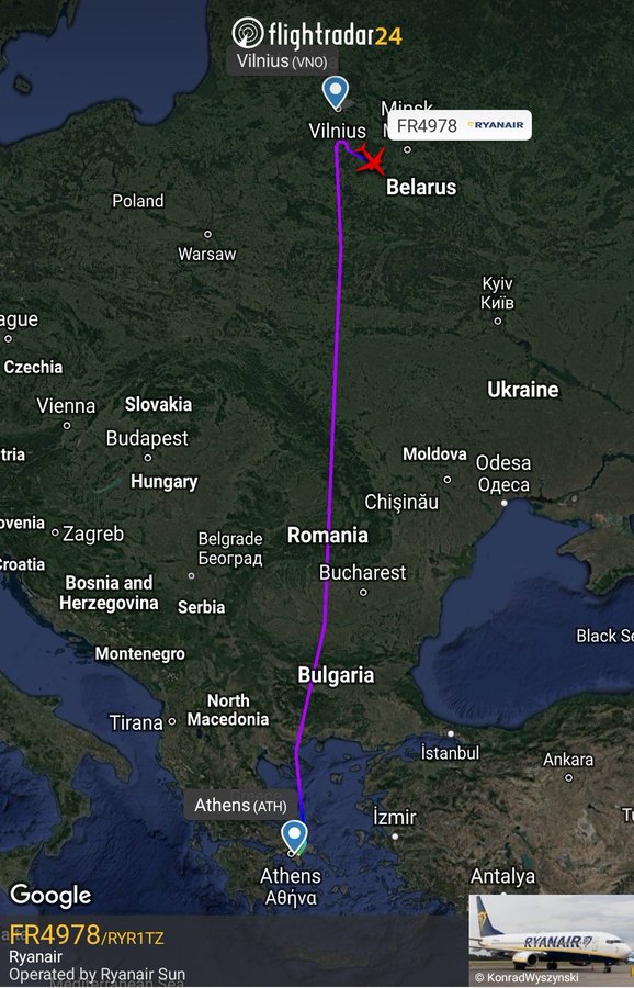 Η πτήση με αριθμό FR4978 / RYR1TZ της Ryanair, αεροσκάφος τύπου Boeing 737-8AS SP-RSM από ΑΘΗΝΑ προς VILNIUS/Βίλνιους (Λιθουανία) δηλώνει έκτακτη ανάγκη Squawk 7700 λεπτά πριν από την προσγείωση. Ένα Μig 29 της Λευκορωσίας εξανάγκασε σε προσγείωση στο Μινσκ την πτήση της Ryanair από Αθήνα προς Βίλνιους (Λιθουανία).TO ΚΑΤΕΒΑΣΕ Ο ΛΟΥΚΑΤΣΕΝΚΟ ΓΙΑ ΝΑ ΣΥΛΛΑΒΕΙ ΚΑΤΑΖΗΤΟΥΜΕΝΟ ΑΝΤΙΚΑΘΕΣΤΩΤΙΚΟ ΠΡΑΚΤΟΡΑ!!