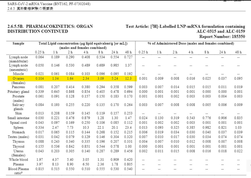Πρόκειται για απόρρητη μελέτη της Pfizer που διέρρευσε από την ΕΜΑ (Ευρωπαϊκό Οργανισμό Φαρμάκων) και δείχνει ότι τα σωματίδια εμβολίου, τα νανοσωματίδια αποθηκεύονται πολύ στις ωοθήκες.H μελέτη έγινε σε ζωικό μοντέλο (ποντίκι / αρουραίος) και η φαρμακοκινητική πρόσληψης των ωοθηκών μπορεί να διαφέρει μεταξύ των ειδών. Δεν είναι δυνατόν να διεξαχθούν αυτά τα πειράματα σε ανθρώπους.Επίσης επιβεβαιώνει ότι δεν υπάρχει ένα συστατικό στείρωσης σε αυτό το εμβόλιο. Υπάρχουν ωστόσο αναπάντητα ερωτήματα. Η σχετική παράγραφος επιβεβαιώνει τη πρόσληψη των ωοθηκών και τη συσώρευσή τους εκεί μάλιστα κάποιες ώρεςμετά τη δόση εμβολίου, αλλά στη συνέχεια αναφέρει μελέτες που αναφέρουν ότι “δεν υπάρχουν επιδράσεις ..δεν εντοπίστηκαν” Ο πίνακας που εμφανίζεται προέρχεται από το έγγραφο μελέτης Pfizer που διέρρευσε, που αναφέρεται στην ανασκόπηση του EMA, που είναι εδώ:https://ema.europa.eu/en/documents/assessment-report/comirnaty-epar-public-assessment-report_en.pdf
