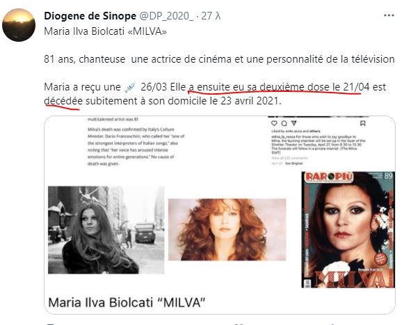 Σοκ. Πέθανε μετά τον εμβολιασμό της η διεθνούς φήμης τραγουδίστρια ιδανική ερμηνεύτρια ως και σε τραγούδια του Θάνου Μικρούτσικου η Ιταλίδα Μίλβα η κατά κόσμον Maria Ilva Biolcati «MILVA» στα 81 της χρόνια. Κατέληξε 2 μέρες μετά τη β΄δόση εμβολιασμού που της χορηγήθηκε στις 21/04/21. Πέθανε στο σπίτι της στο Μιλάνο από αιφνίδιο θάνατο στις 23/4/21. H Τραγουδίστρια, ηθοποιός και προσωπικότητα της τηλεόρασης είχε δεχθεί την πρώτη δόση στις 26/3/21..Έπασχε και από χρόνια νόσο..