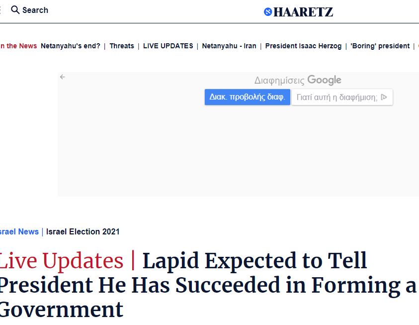 Ισραήλ…ΤΟΝ ΡΙΞΑΝΕ ΤΟΝ ΠΑΝΕΜΒΟΛΙΑΣΤΗ..έπεσε ο Νετανιάχου ΜΕ ΣΑΣΠΕΝΣ ΣΥΜΦΩΝΙΑ ΣΤΟ ΠΑΡΑ 5′..μια ώρα πριν εκπνεύσει η προθεσμία που έληγε σήμερα τα μεσάνυχτα. Για α΄φορά αραβικό κόμμα προστίθεται σε κυβερνητικό συνασπισμό!Eίναι το ισλαμιστικό κόμμα RAAM!O επικεφαλής του Mansour Abbas μίλησε για μια δύσκολη απόφαση…O Lapid ήδη ενημέρωσε τον Πρόεδρο Rivlin τηλεφωνικά ότι σχημάτισε κυβέρνηση…Ο Lapid αναφέρει πως είχε την τιμή να ενημερώσει τον