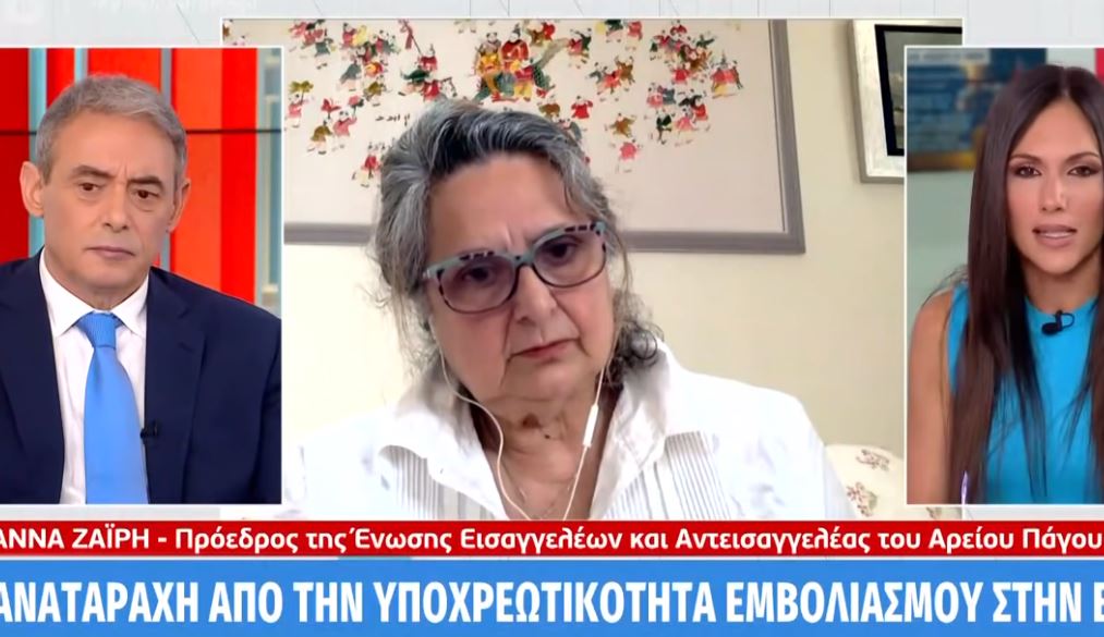 H κ.Άννα Ζαΐρη Πρόεδρος Ελλήνων Εισαγγελέων και Αντιεισαγγελέας του Αρείου Πάγου μίλησε για τον υποχρεωτικό εμβολιασμό κατά covid19 στην εκπομπή «Κοινωνία Ώρα ΜEGA» : Παρακολουθώ τους Συνταγματολόγους σε αυτό το θέμα κι είναι όλοι αρνητικοί δηλ. δεν μπορείς να υποβάλεις έναν άνθρωπο να υποστεί μια σωματική επέμβαση όσο κι αν αυτό είναι μια απλή ένεση (σσ. πολύ περισσότερο όταν δεν είναι μια απλή ένεση) και μάλιστα στο βαθμό που αυτό μπορεί να έχει κι επίδραση στον οργανισμό του.Μην ξεχνάμε ότι το υποχρεωτικό είναι κάτι που πρέπει να σχετίζεται πάντα με το κατά πόσο μπορεί ο άλλος.Η Υποχρεωτικότητα σε έναν τέτοιο τομέα είναι περίπου αδύνατη γιατί κανείς οργανισμός δεν είναι ίδιος με τον άλλον, άλλον κίνδυνο διατρέχει ο α΄ κι άλλον ο β΄ κι απ΄ότι παρακολουθώ από τους Συνταγματολόγους όλοι είναι αρνητικοί.