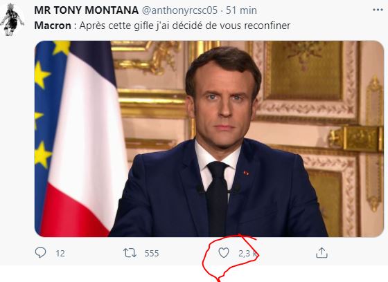 Κάποιοι σχολιάζουν στο twitter τους έβγαλε μάτια τους έκοψε χέρια έφαγε και μια με την άκρη των δαχτύλων δεν τρέχει και τίποτα. Άλλοι σχολιάζουν με αυτή τη χειροδικια μόλις μεταδόθηκε το covid19 στο Μακρόν..τα έσπασε ανάρτηση που λέει: ”Macron: μετά από αυτό χαστούκι αποφάσισα να σας ξαναβάλω σε lockdown”