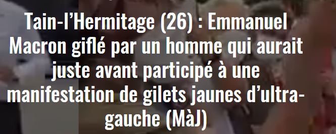 Πριν από λίγο άτομο χαστούκισε τον Πρόεδρο Γαλλίας τον Emmanuel Macron κατά τη διάρκεια μιας περιοδείας του στο Tain-l’Hermitage στο Drôme. Δύο άτομα συνελήφθησαν. Νεαρό άτομο όταν ο Μακρόν πλησίασε το κιγκλίδωμα όπου ήταν το πλήθος για να χαιρετίσει τον κράτησε με το ένα χέρι και με το άλλο τον χαστούκισε δυνατά. Έχει πολύ ενδιαφέρον να δούμε το προφίλ του ατόμου.. Το κύρος πάντως του Μακρόν καταρρακώθηκε..”Montjoie ! Saint-Denis !κάτω η Macronie” φώναξε το άτομο. Η αναφορά στο Saint Denis είναι για το δύσκολο καρτιέ του Παρισιού με cités.