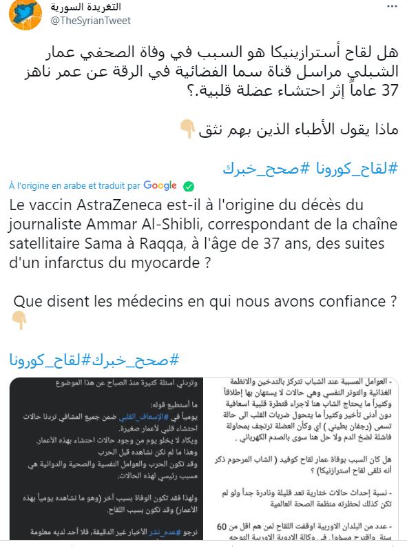 Στα σχόλια καταγγέλεται από συριακά μέσα και χρήστες στα μέσα κοινωνικής δικτύωσης ότι έλαβε το εμβόλιο της Astra Zeneca. To The Syrian Tweet ένας μεγάλος φιλοκυβερνητικός λογαριασμός με σχεδόν 50.000 ακόλουθους αναρωτιέται αν ο δημοσιογράφος πέθανε από το εμβόλιο AstraZeneca. Στη συνέχεια χρήστε το επιβεβαιώνουν.Αυτό που διαφαίνεται σίγουρα είναι ότι ο δημοσιογράφος είχε εμβολιαστεί με AstraZeneca.