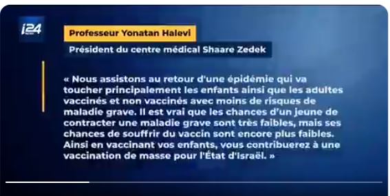 Ο καθηγητής Yonatan Halevi Πρόεδρος του Ιατρικού Κέντρου Shaare Zedek:” είμαστε στην επιστροφή μια επιδημίας που αγγίζει κυρίως τα παιδιά όσο κι ενήλικους εμβολιασμένους ή μη με λιγότερους κινδύνους ν΄ασθενήσουν σοβαρά. Είναι αλήθεια η περίπτωση ένας νέος να νοσήσει πολύ σοβαρά είναι πολύ αδύναμη αλλά η περίπτωση να υποφέρει από το εμβόλιο είναι ακόμη πιο αδύναμες.(σσ έτσι έλεγαν και για τα εμβόλια για ενηλίκους και όμως η πραγματικότητα ήταν πολύ διαφορετική κι εδώ μιλάμε για παιδιά) έτσι εμβολιάζοντας τα παιδιά σας συμβάλλεται σ΄ένα μαζικό εμβολιασμό στο κράτος του Ισραήλ”.Τα εμβόλια που εγκρίθηκαν σε καθεστώς έκτακτης ανάγκης μην εξασφαλίζοντας την κανονική υπό άλλες συνθήκες αδειοδότηση υπόσχονταν σχεδόν 100% κάλυψη πάντως πάνω από 90% κι όμως αποδείχθηκε στην πράξη όπως και στην περίπτωση του Ισραήλ που ο ένας στους δυο νεομολυσμένους είναι εμβολιασμένος ότι δεν ευσταθούσε η υποσχεσιολογία.