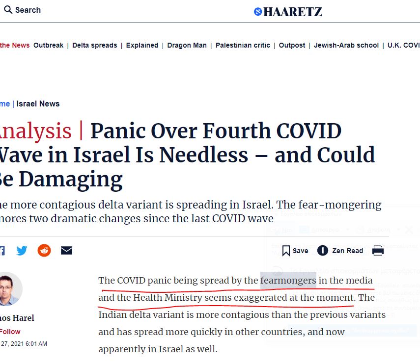 Μια πρωτοφανής καταχώρηση άρθρου στη Haaretz: ”Ο πανικός COVID που διαδίδεται από τους εκφοβιστές (σσ δεν απέχει πολύ από τον όρο τρομοκράτες αυτούς δηλ. που ενσπείρουν τον τρόμο) των ΜΜΕ και του Υπουργείου Υγείας φαίνεται υπερβολικός αυτή τη στιγμή. Η παραλλαγή του ινδικού δέλτα είναι πιο μεταδοτική από τις προηγούμενες παραλλαγές και έχει εξαπλωθεί πιο γρήγορα σε άλλες χώρες, και τώρα προφανώς και στο Ισραήλ. Όμως, ο φόβος, που φαίνεται ότι εν μέρει τροφοδοτείται από μια ισχυρή λαχτάρα για κάποιο τηλεοπτικό προσκήνιο, αγνοεί δύο δραματικές αλλαγές στην κατάσταση από τότε που το τρίτο κύμα του κοροναϊού υποχώρησε τον Μάρτιο” Και λέει πιο κάτω τα εμβόλια θα ανασχέσουν την απειλή άρα δεν υπάρχει λόγος ανησυχίας. Όπως και να έχουν τα πράγματα η Haaretz πρωτοτυπεί κι ακολουθεί κάπως γραμμή Bild. Mιλάει για κλίμα πανικού που διαμορφώνουν τα ΜΜΕ και οι πολιτικοί ιθύνοντες με πρώτα τα Υπουργεία Υγείας!!!