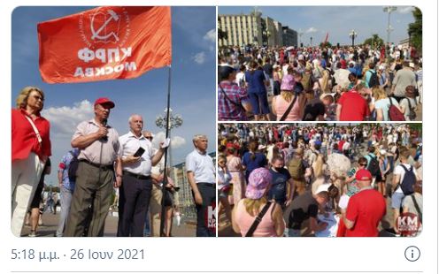 Στη Μόσχα, σχεδόν 1000 άτομα συγκεντρώθηκαν στη διαμαρτυρία του Κομμουνιστικού Κόμματος κατά του υποχρεωτικού εμβολιασμού κατά του COVID-19, αναφέρει ο ανταποκριτής του Kommersant. Η εκδήλωση στην πλατεία Novopushkinsky τελείωσε με τη διάλυση των συμμετεχόντων, η αστυνομία και η αστυνομία κατά διαδηλώσεων συνέλαβαν περισσότερους από δέκα διαδηλωτές. Ανάμεσά τους ήταν ο Νικολάι Ζουμπριλίν, επικεφαλής της κομμουνιστικής παράταξης στην Δούμα της Μόσχας που τελικά συνελήφθηκε.