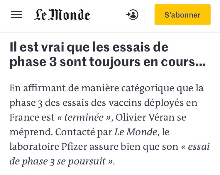 Σε επαφή με το Le Monde, το εργαστήριο της Pfizer διαβεβαιώνει ότι η «δοκιμή φάσης 3 του εμβολίου συνεχίζεται» που όπως λέει η έγκριτη εφημερίδα αποτελεί ”το τελευταίο και πιο σημαντικό βήμα ως η φάση 3”. (σσ Δηλ. το εμβόλιο κατά παραδοχή της εταιρίας δεν έχει ολοκληρώσει τις απαραίτητες κλινικές δοκιμές και μάλιστα την πιο σημαντική ως εκ τούτου είναι πειραματικό και κατά συνέπεια είναι άτοπο να επιχειρείται ο υποχρεωτικός του χαρακτήρας. Πήρε αδειοδότηση κυκλοφορίας κι όχι έγκριση με το πρόσχημα της Έκτακτης ανάγκης.. Από τις εν εξελίξει κλινικές δοκιμές εξαρτάται και ”η παρακολούθηση πιθανών αλλαγών στην ισορροπία οφέλους / κινδύνων, ένα κρίσιμο στοιχείο στον αγώνα για εμβολιασμό”. Πως επικαλούνται την θετική ισορροπία οφέλους / κινδύνων όταν αυτή είναι ακόμη υπό παρακολούθηση όπως αναφέρει η έγκριτη γαλλική εφημερίδα;;;;)