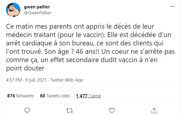 ”Σήμερα το πρωί οι γονείς μου έμαθαν για το θάνατο του θεράποντος ιατρού τους (για το εμβόλιο). Πέθανε από καρδιακή ανακοπή στο γραφείο της, την βρήκαν οι πελάτες. Η ηλικία της 46 ετών !! Μια καρδιά δεν σταματά έτσι, αναμφίβολα μια παρενέργεια του εν λόγω εμβολίου ” Ανάρτηση 9/7/21