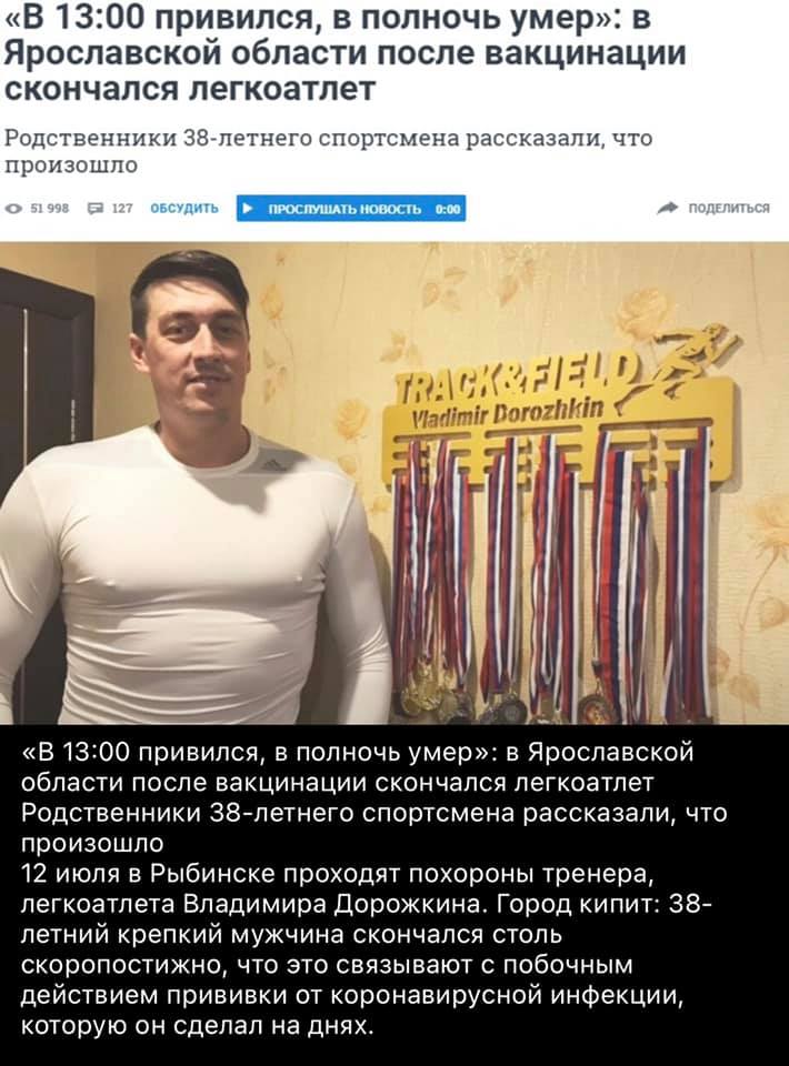 Στις 12 Ιουλίου,έγινε η κηδεία του προπονητή και αθλητή Vladimir Dorozhkin στο Rybinsk. Η πόλη είναι σ΄αναβρασμό : ένας υγειής και δυνατός άντρας 38 ετών πέθανε τόσο ξαφνικά προφανώς από παρενέργεια του εμβολίου κορωναϊού που έλαβε τις προάλλες.