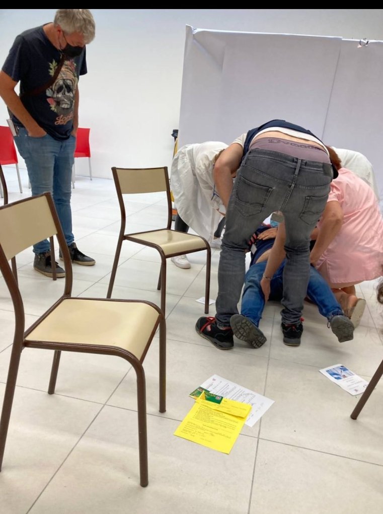 Σήμερα το πρωί Σαββάτου 24/7/21 στο Betting στη Moselle άτομο νεαρός ηλικίας προσήλθε στον υποχρεωτικό εκβιαστικό κι απάνθρωπο πειραματικό ψευδεπίγραφο εμβολιασμό γονιδιακής θεραπείας γενετικών εμβολίων και μετά τη δόση που του σούταραν με τον ορό τη σύριγγα τη ένεση κοκάλωσε έπεσε κάτω αναίσθητος σε ημικωματώδη κατάσταση όπως φαίνεται από την εικόνα και επιχειρούν να τον συνεφέρουν ως και με μαλάξεις ενδεχομένως… H τύχη του άγνωστη…