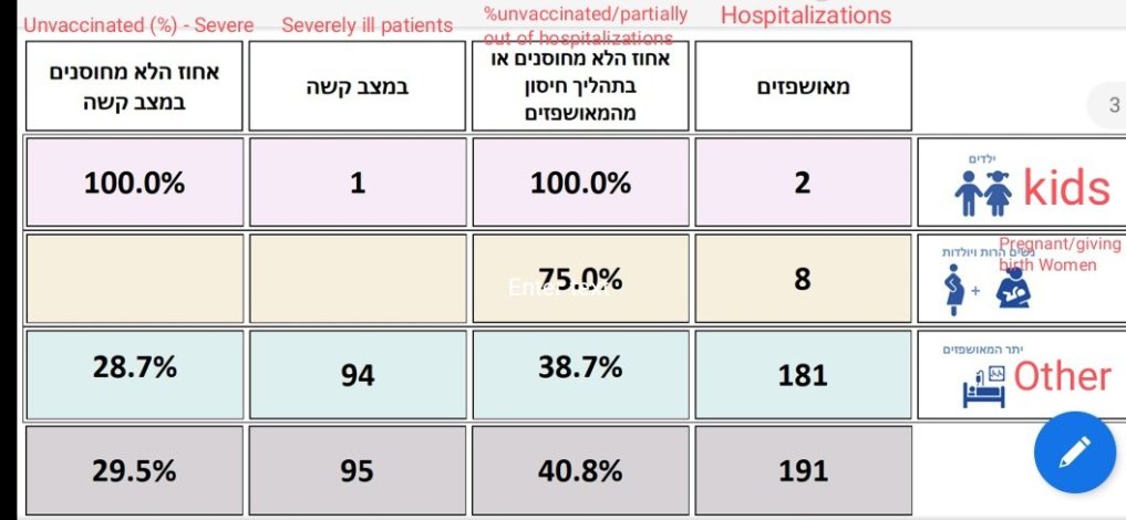 Το Ισραήλ καταγράφει στις 25.07.2021 σύμφωνα με τον επίσημο λογαριασμό iMoH telegram του Υπ. Υγείας για τους σοβαρά ασθενείς με COVID-19: 28 ανεμβολίαστους/μερικώς εμβολιασμένους (άρα οι ανεμβολίαστοι είναι και λιγότεροι και 67 πλήρως εμβολιασμένους. Είναι μια πανδημία των εμβολιασμένων αφού η αποτελεσματικότητα των υποχρεωτικών εμβολίων είναι 39% με συνεχή φθίνουσα τάση….