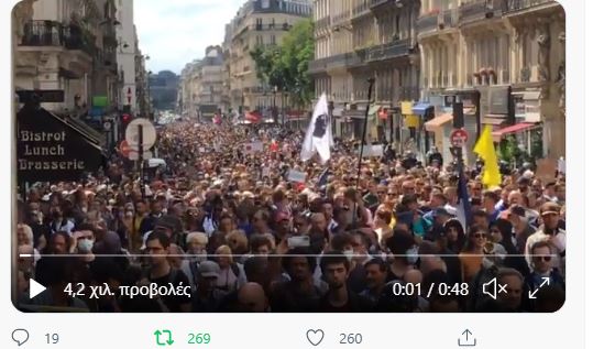 Εκατοντάδες χιλιάδες διαδηλώνουν στη Γαλλία. Βούλιαξε το Παρίσι πάνω από 100.000 κατά υποχρεωτικού εμβολιασμού και paSS sanitaire.Συγκρούσεις επεισόδια!! Ετερόκλητο πλήθος αυτό θα πει λαός…απαιτεί ΠΑΡΑΙΤΗΣΗ ΜΑΚΡΟΝ κι ΕΛΕΥΘΕΡΙΑ!!Το κίνημα περιλαμβάνει 50% του πληθυσμού κι υποστηρίζεται από άλλο 40% σύμφωνα με δημοσκοπήσεις όλοι θέλουν το τέλος της υγειονομικής χούντας!!!!Οι θεσμοί στράφηκαν κατά των Ανθρωπίνων Δικαιωμάτων τα Συντάγματα που με αγώνες οι λαοί ανέκτησαν από Απολυταρχία έγιναν κουρελόχαρτα….Η αποκατάσταση του πολιτεύματος είναι το πρώτο μέλημα….Οι Γάλλοι απαιτούν επιστροφή όχι στην κανονικότητα αλλά στη Νομιμότητα.…