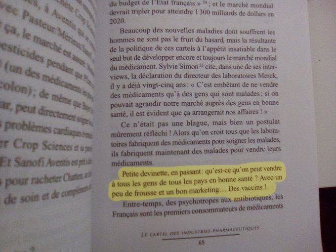 Πολλές από τις νέες ασθένειες εκ των οποίων υποφέρουν οι άνθρωποι δεν είναι καρπός της τύχης αλλά το αποτέλεσμα της πολιτικής αυτών των καρτέλ με μόνο σκοπό ν΄αναπτύξουν ακόμη περισσότερο και πάντα την παγκόσμια αγορά φαρμάκων. Η Sylvie Simon επικαλείται σε μια από τις συνεντεύξεις της τη δήλωση του Διευθυντή των εργαστηρίων Merck που έγινε εδώ και 25 χρόνια: Είναι βλακώδες να μην πουλάμε φάρμακα παρά μόνο σε ασθενείς..αν μπορούσαμε να διευρύνουμε την αγορά μας σε άτομα με καλή υγεία είναι προφανές ότι αυτό θα τακτοποιούσε τις μπίζνες μας”..Ενώ πιστεύουμε όλοι πως τα εργαστήρια κατασκευάζουν φάρμακα για να περιθάλψουν τους αρρώστους αυτοί κατασκευάζουν τώρα ασθενείς για να πουλήσουν τα φάρμακά τους. Aίνιγμα εν παρόδω: τι μπορούμε να πουλήσουμε σε όλα τα υγιή άτομα σε όλες τις χώρες;;Mε λίγο φόβο και καλό marketing.. Εμβόλια!