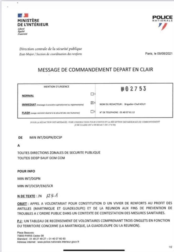 Το Υπουργείο Εσωτερικών του Δ΄Ράιχ της Γαλλίας του (DSCP) ζητάει με επείγοντα έγγραφα ενισχύσεις από όλα τα αστυνομικά τμήματα της Γαλλίας για να τις στείλει στις Αντίλλες ( Μαρτινίκα στη Γουαδελούπη) και στο νησί στον Ινδικό Ωκεανό στη Réunion γαλλικές κτήσεις κι αποικίες με σκοπό την πρόληψη « ταραχών κατά της δημόσιας τάξης στο πλαίσιο της αμφισβήτησης για τα υγειονομικά μέτρα». Ο Μακρόν δείχνει τώρα το χειρότερο πρόσωπο της Γαλλίας αυτό του στυγνού αποικιοκρατισμού που μισεί η Αφρική και η Μέση Ανατολή…Δεν πρόκειται για πρόληψη αλλά για ωμή καταστολή των εκεί κινητοποιήσεων..