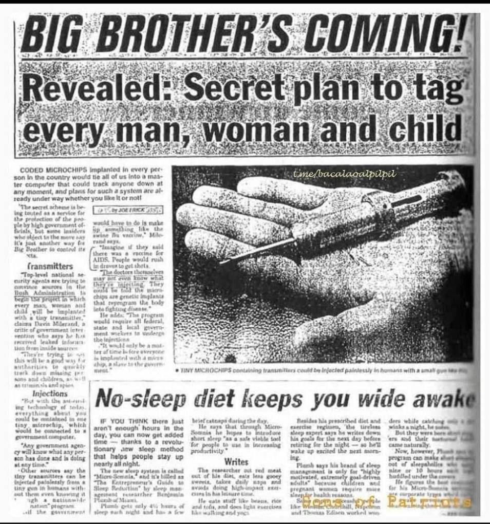 Με τίτλο “Ο Mεγάλος Aδελφός έρχεται. Αποκάλυψη: το μυστικό σχέδιο να μαρκάρουν κάθε άνδρα, γυναίκα και παιδί “, ανέφερε ένα μυστικό κυβερνητικό σχέδιο για την ανάπτυξη μικροτσίπ για την παρακολούθηση κάθε ατόμου στον πληθυσμό.