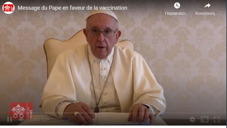 Mε νέο μήνυμα του μέσω vidéo, για την υποστήριξη της καμπάνιας « It’s up to you » για μαζικό εμβολιασμό σε ΗΠΑ και λοιπές χώρες Αμερικής ο 84χρονος Πάπας Φραγκίσκος (σσ καλά αυτοί σίγουρα δεν παθαίνουν Αλτσχάιμερ;;) απευθύνει κάλεσμα για εμβολιασμό τα καλά των δικών μας..Το μήνυμα το απεύθυνε στην ισπανική γιατί κυρίως προσβλέπει στην Λατινική Αμερική όπου το κλίμα είναι πιο ζηλωτικό κι ο κόσμος δεν εμβολιάζεται.