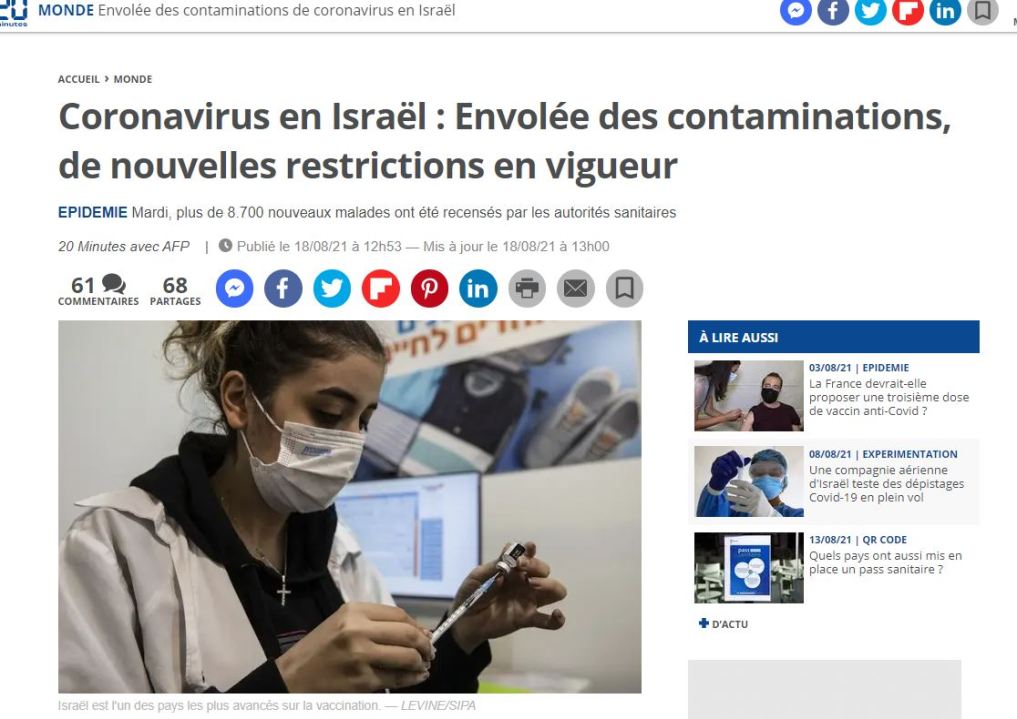ΠΑΤΑΓΩΔΗ ΑΠΟΤΥΧΙΑ στο Ισραήλ. 8.700 νέα κρούσματα σε 1 ημέρα στο πανεμβολιασμένο Ισραήλ! Αρνητικό ρεκόρ από το Γενάρη!!Έπιασε πάτο η ένεση .. αυτή δεν είναι σύριγγα είναι βαρίδι! Τρίτη, πάνω από 8.700 νέα κρούσματα καταγράφηκαν από τις αρχές.Σε πανικό παίρνουν νέα μέτρα την Τετάρτη.Το εμβόλιο είναι το μόνο μας όπλο που ρίχνει άσφαιρα πυρά….Αχρηστεύθηκε το υπερόπλο της Pfizer..To Yπ. Υγείας του Ισραήλ έδινε αποτελεσματικότητα του εμβολίου τελευταία 38% τώρα θα είναι στο 10%…To πείραμα απέτυχε παράδειγμα προς αποφυγή το Ισραήλ.