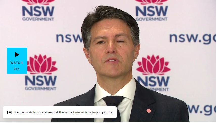 Ο υπουργός Εξυπηρέτησης Πελατών της Νέας Νότιας Ουαλίας με το πιο φρικτό υγειονομικό ναζιστικό καθεστώς Victor Dominello διαγνώστηκε με παράλυση Bell ( είναι γνωστό πως τα εμβόλια προκαλούν οαράλυση προσώπου κατά κόρον) αφού ανήσυχοι οι ακροατές μιας συνέντευξης Τύπου παρατήρησαν μέρος του προσώπου του να γέρνει και τον παρότρυναν να αναζητήσει ιατρική βοήθεια.