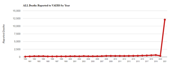 Ωστόσο, η θνησιμότητα που σχετίζεται στη Δύση με τον εμβολιασμό κατά της Covid λόγω των 4 εμβολίων DNA ή RNA που κατασκευάζονται από αγγλοσαξονικές εταιρείες αποτελεί ένα πρωτοφανές ιστορικό γεγονός. Το συγκριτικό γράφημα που δίνει η αμερικάνικη φαρμακοεπαγρύπνησης (VAERS) που απαριθμεί τις αρνητικές επιπτώσεις που σχετίζονται με τα εμβόλια από το 1990 ως σήμερα δίνει αυτό το εντυπωσιακά δραματικό αποτέλεσμα εκτοξεύονται οι θάνατοι το 2021 (Εικόνα 1):