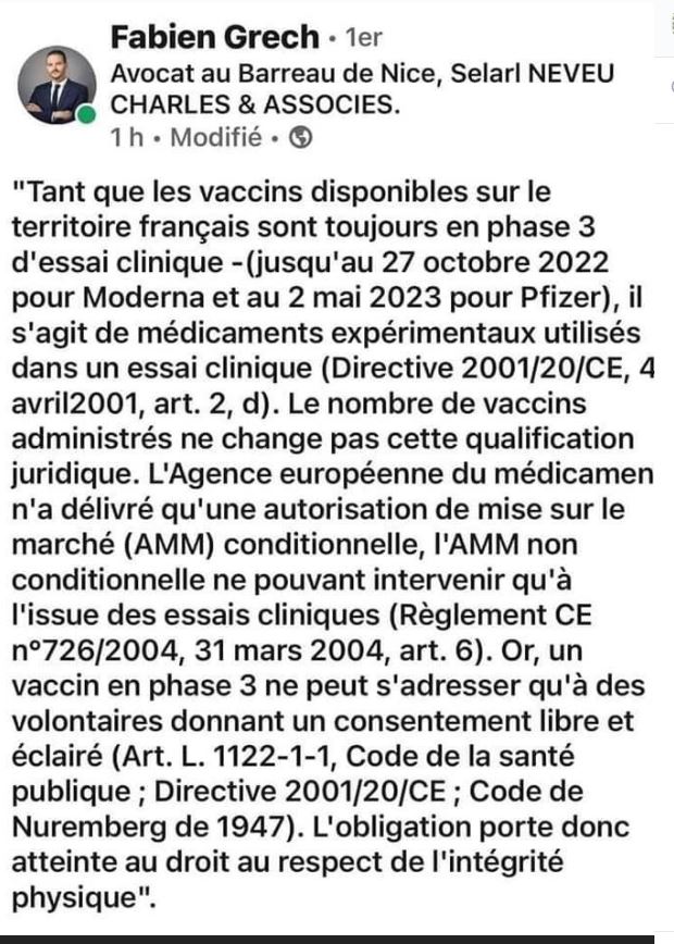 ( Ο νομικός Fabien Grech εδώ από Νίκαια Γαλλία κάνει μια υπόμνηση σε αυτό ότι είναι και παραμένουν πειραματικά γιατί οι κλινικές δοκιμές Pfizer λήγουν 2 Μαίου 2023 και ότι η υποχρεωτική χορήγηση τους αντιβαίνει το σεβασμό της σωματικής ακεραιότητας.) 23/8/21 που δόθηκε χθες η τελική έγκριση με 2/5/23 που έληγε η προβλεπόμενη γ΄φάση κλινικών δοκιμών είναι ένα διάστημα 1 έτους και 8 μήνες υπάρχει σαφής ανακολουθία που βάλει κατά αξιοπιστίας και εταιρίας και θεσμού που την συγκαλύπτει! Με τι εχέγγυα δόθηκε η έγκριση αφού δεν θα λάβουν υπόψιν τουλάχιστον τα 2/3 των κλινικών δοκιμών γ΄φάσης;;;