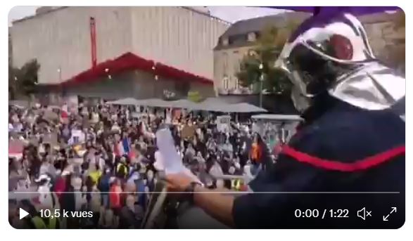 Σκηνές εξέγερσης και γενικευμένης πολιτικής ανυπακοής στη φασιστοκρατούμενη από την παγκόσμια ελίτ Γαλλία. Στην πόλη Metz οι πυροσβέστες όχι μόνοι ένστολοι ενώθηκα με το λαό πήραν το λόγο μπροστά στο πλήθος και εκπρόσωπός του μίλησε παθιασμένα: “Δεσμευτήκαμε να υπηρετούμε το γενικό συμφέρον του πληθυσμού και συνεχίζουμε να παλεύουμε για τις θεμελιώδεις ελευθερίες και πάντα με θάρρος και αφοσίωση” Χειροκροτήματα! Στην place de la Republique.. η συγκέντρωση έγινε κατά υγειονομικού πάσου, υποχρεωτικού εμβολιασμού και εμβολιασμού παιδιών!!