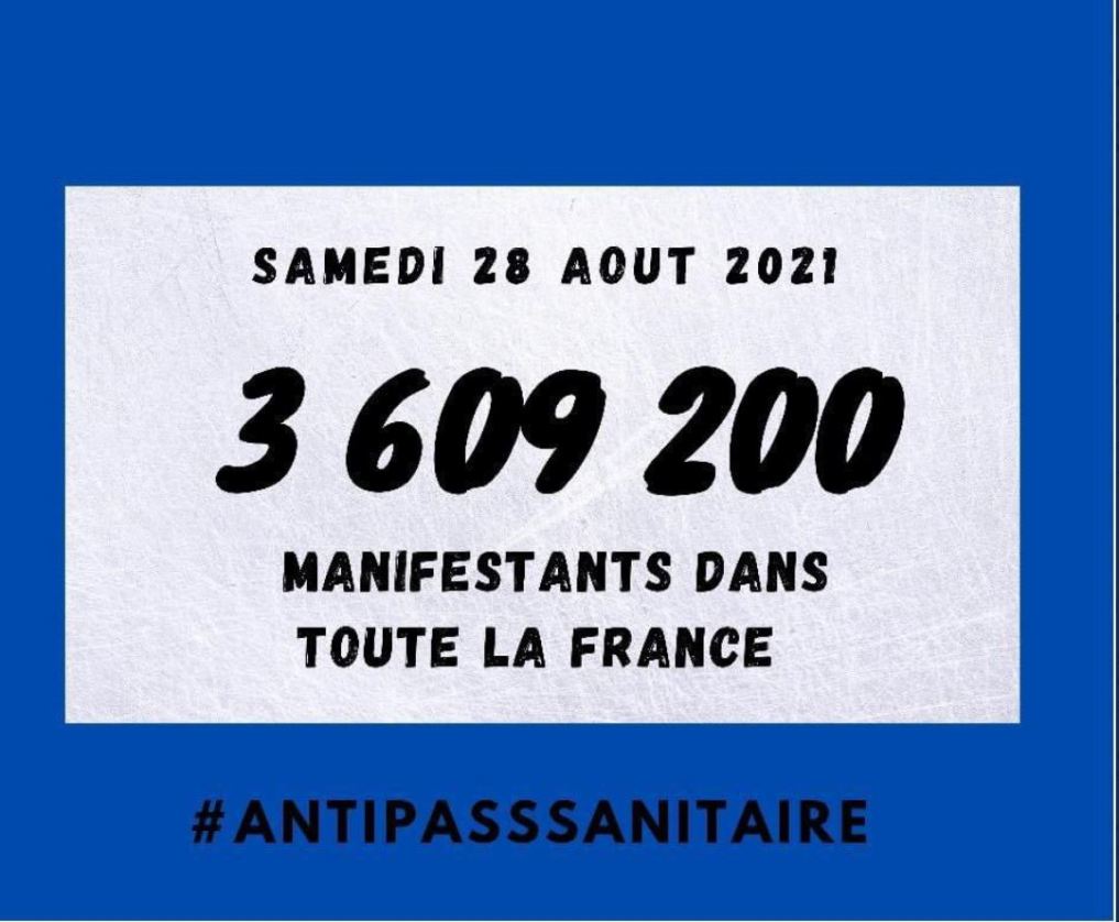 Η κινητοποίηση στη Γαλλία κατά υγειονομικού πάσου υποχρεωτικού εμβολιασμού το Σάββατο 28 Αυγούστου 2021 συγκέντρωσε 3 609 200 σε πολλές πόλεις της Γαλλίας.Ο υπολογισμός έγινε επί λογισμού αναγνώρισης ανθρώπων από βίντεο των διαδηλώσεων και υπολογισμό των διοργανωτών.611 εθελοντές εργάστηκαν αυτού κι έδωσαν αυτήν την απίστευτη δουλειά που κονιορτοποιεί την καθεστωτική προπαγάνδα διαψεύδοντας τα κίβδηλα νούμερα…Η μαζικότητα και το πάθος αυξάνουν μέρα με τη μέρα..