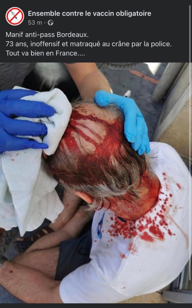 Σε 73χρονο διαδηλωτή οι πραιτοριανοί του Μακρόν του άνοιξαν το κεφάλι άλλο λίγο θα του έχυναν και τα μυαλά γιατί δεν θέλει να εμβολιαστεί στο Bordeaux/Μπορντώ κατά τη διάρκεια μαζικής κινητοποίησης στις 28 Αυγούστου Σάββατο κατά υγειονομικού πάσου κι υποχρεωτικού εμβολιασμού.Μίσος..του άνοιξαν το κεφάλι με γκλομπ.. έχει χάσει τη ψυχραιμία του καθεστώς καθώς η αντίδραση γενικεύεται. Φαίνεται τ΄όργανα καταστολής έχουν εντολές βαράτε στο ψαχνό τσακίστε τους…Bordeaux ή bordel;