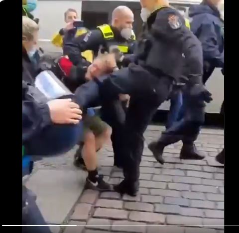 Τον συλλαμβάνουν οι αστυνομικοί κι ενώ έχει συλληφθεί τον τραβάνε από τα μαλλιά προφανώς βρίσκουν μεμπτό το ότι έχει μαλλιά γιατί αυτοί είναι ξυρισμένα κεφάλια ενεδικτικο του εξτρεμισμού τους ο ένας αστυνομικός του κοπανάει με σφοδρότητα κλωτσιά στο λαιμό ο διαδηλωτής πέφτει στο έδαφος σέρνεται επί της γης τον σέρνουν σαν τσουβάλι και είναι 10 αστυνομικοί στην επιχείρηση που στο τέλος αλληλοβραβεύονται για την κτηνώδη συμπεριφορά τους. Όλα αυτά σε αντιβιονομιστική διαδήλωση κατά υγειονομικού πάσου κίτρονου άστρου κι υποχρεωτικού πειραματικού εμβολιασμού… Ξέφυγαν εντελώς …με βία και προπαγάνδα τρομοκρατία..