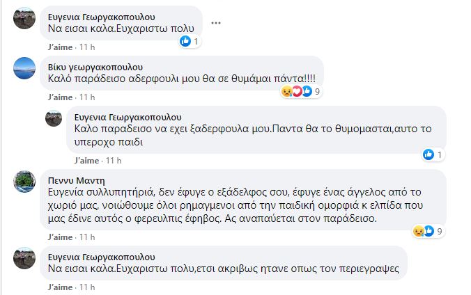 ”Εχτες τα ξημερωματα.Εφυγε ο ξαδερφος μου,ενα υπεροχο παιδι,γλυκιτατο,καλοσυνατο.Παντα ολοι μας οτι και να του λεγαμε δεν μας χαλαγε χατιρι.Δεν τον εζησα πολυ καιρο,παρα μονο 2 χρονια.Δεν ξερουμε απο τι εφυγε.Αλλα εκανε την Παρασκευη την πρωτη δοση του εμβολιου.Για να παει σχολειο.Και να ειναι καλυμμενος εστω και λιγο απο τον Κωρονοιο.Και ο ξαδερφουλης μου.Εφυγε απο το εμβολιο.Γιατι ητανε υγιεστατος δεν ειχε κατι.Ας ελπισουμε οτι θα εχουν τα κοτσια,να μας πουν απο τι εφυγε.Καλο παραδεισο ξαδερφουλη μου και το χωμα που θα σε σκεπασει να ειναι ελαφρυ.Παντα θα βρισκεσαι στης καρδιες μας” Παρούσα στην διαδικτυακή κουβέντα και η αδερφή του αποθανόντος μαθητή η Βίκυ Γεωργακοπούλου που έχει μια σύντομη στιχομυθία με την ξαδέλφη της και δείχνει να ενστερνίζεται την καταγγελία.