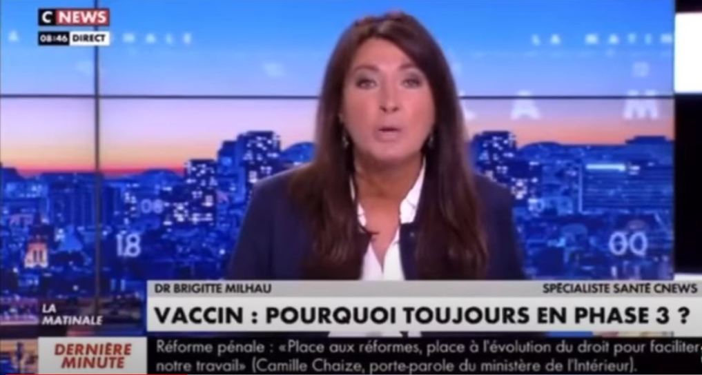 Στο κανάλι CNEWS σήμερα 17/9/21 το πρωί η γιατρός και τηλεπαρουσιάστρια χρονικογράφος δημοσιογράφος σε θέματα Ιατρικής η Γαλλίδα Brigitte Milhau επιβεβαίωσε ότι τα εμβόλια είναι σε φάση πειραματισμού ! Σε αυτούς που λένε εμφαντικά ότι το εμβόλιο είναι πάντα σε φάση πειραματισμού. Ναι έχετε δίκιο είναι πάντα σε φάση πειραματισμού. Σας υπενθυμίζω ότι το εμβόλιο mRNA Moderna είναι σε φάση πειραματισμού ως τον Οκτώβρη του 2022 και το εμβόλιο της Pfizer είναι σε φάση πειραματισμού ως τις 3 Μάϊου 2023.Επομένως κι αυτό είναι σοβαρό για την ασφάλεια σας τα εμβόλια είναι σε φάση πειραματισμού.” Είμαστε πάντα στη φάση 3 των κλινικών δοκιμών μια πειραματική φάση..