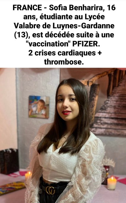 Υπάρχουν αναρτήσεις ότι 16χρονη μαθήτρια Λυκείου η Sofia Benharira πέθανε αφότου εμβολιάστηκε με δόση της Pfizer. Ήταν μαθήτρια στο Λύκειο Valabre της Luynes-Gardanne(13) στη Γαλλία.Υπέστη σύμφωνα με τις πληροφορίες αυτές 2 ανακοπές καρδιάς και θρόμβωση. Η μαθήτρια απεβίωσε στις 21 Σεπτεμβρίου 2021 στην Aix-en-Provence.